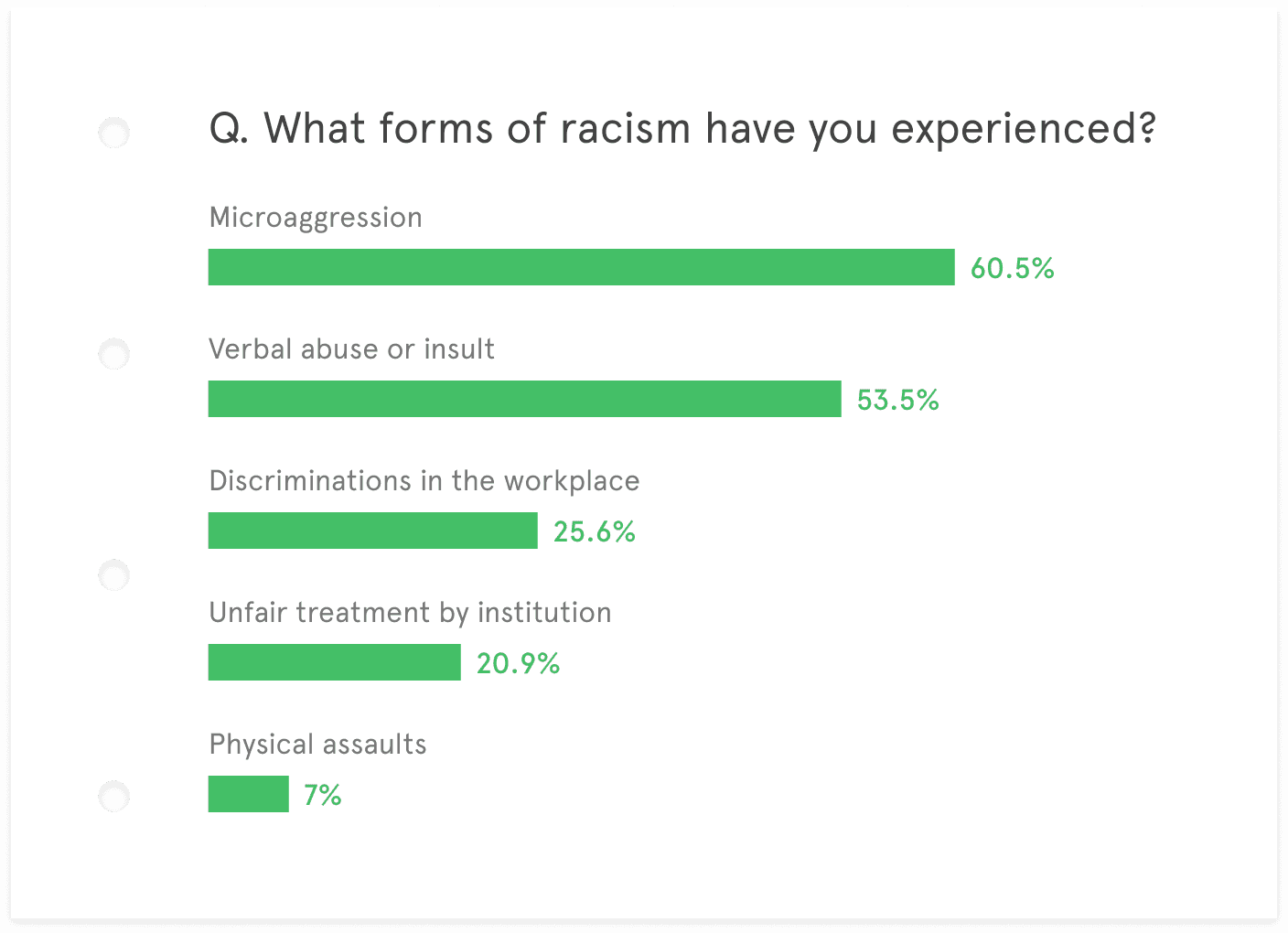 Verbal abuse and microaggressions were the most common forms of racism.