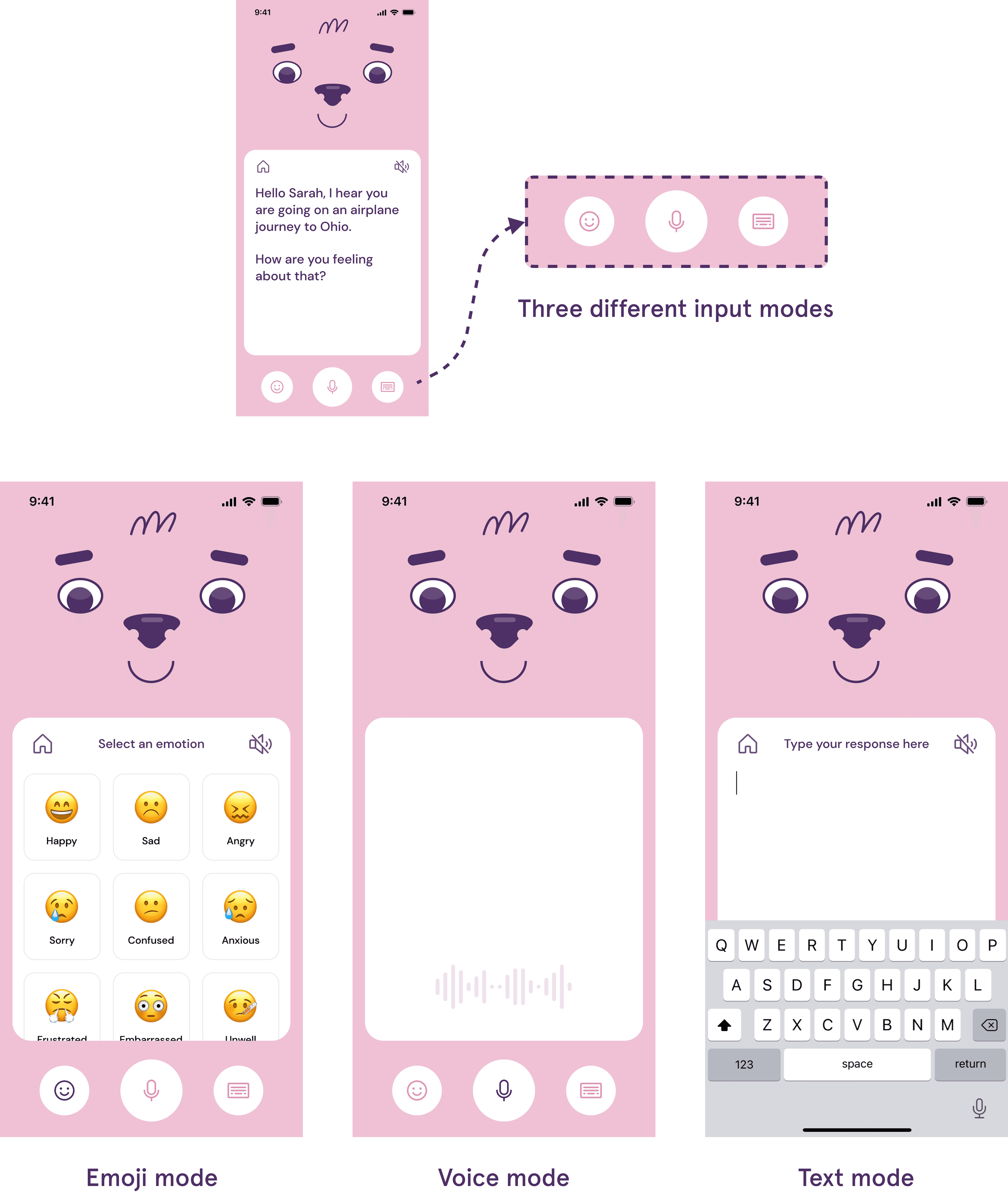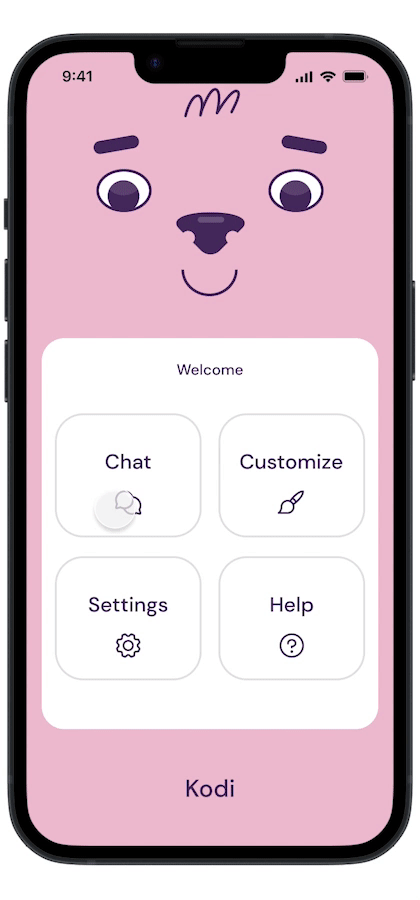 Users can express their feelings via emoji, voice, or keyboard, choosing the mode that feels most comfortable. Kodi responds to children’s inputs with an animated face that supports emotional connection.